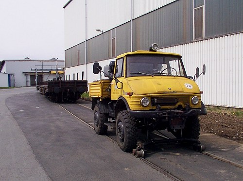 04.05.2003/ jm/ Der Zweiwege-Unimog ist seit 4-5 Jahren hier. Er wurde gebraucht erworben, der Vorbesitzer konnte nicht ermittelt werden. Es handelt sich noch um den alten Typ U 403 mit einer Zweiwege-Ausrüstung von Zweiweg-Schneider. Der Unimog ist heute eigentlich zu schwach für den gestiegenen Wagenladungsverkehr, mittlerweile wurden die Bremsluftbehälter von 2 auf 4 verdoppelt. Ungünstig ist auch, dass der Unimog nur hinten eine Kuppelstange hat. Eine "normale" Lok kommt wegen der Gleislage nicht in Frage, da man hier oft abgestellte Wagen auf der Straße umfahren muß. Vor dem Unimog gab es hier kein Rangierfahrzeug, das Waggonaufkommen war so gering, dass die Wagen von der DB entsprechend zu gestellt wurden - im Notfall mußte halt mal ein Trecker schieben. Heute stellt die Siegener Kreisbahn die Wagen über das steile Anschlussgleis bis ins Werk zu, der Unimog rangiert nur im Werksbereich.