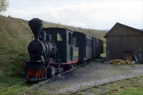 07.09.2007/ jm/ Der Lokschuppen wurde mittlerweile an das Streckengleis mit einer Weiche angebunden. Um die Loks in den Schuppen zu ziehen, gibt es am Gleisende hinter dem Schuppen eine Seilwinde. Vor dem Schuppen stand die Krauss FNr. 7377 (lt. Schlagzahlen an den Stangen) mit einem Zug, offensichtlich betriebsfähig. Im Schuppen wurde die zweite Krauss-Dampflok (dürfte FNr. 7056 - im dunklen Schuppen nicht an den Stangen gefunden) angetroffen, welche ebenfalls einen betriebsfähigen Eindruck macht.