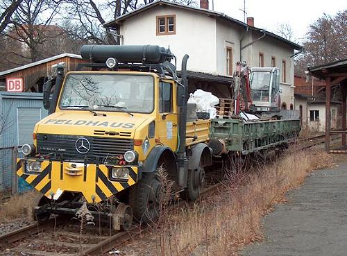 Feldhaus: Der Zweiwege-Unimog im Bahnhof in Lichtenwalde-Braunsdorf. (Foto: Sammlung Erik Rauner)