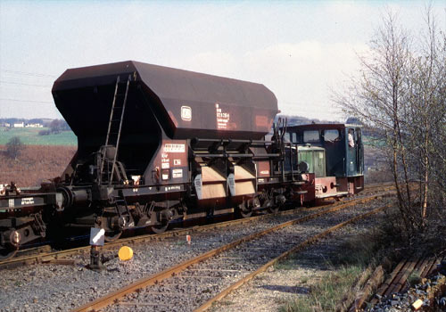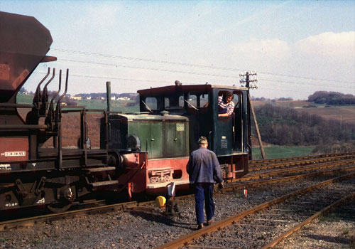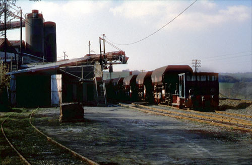 Adrian: Blick auf die Verladeanlagen, rechts neben der Jung FNr. 13062/1959 ist das DB-Streckengleis. (Foto: 22.04.1987, Ulrich Neumann)