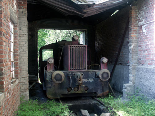 28.05.2005/ jm/ Das Werk gehört mittlerweile der BAG und ist über eine ausgebaute Straße mit dem Werk in Stockum-Püschen verbunden. Die Verladung erfolgt offenbar aber nur noch auf LKW, denn der Bahnanschluss liegt still und ist durch einen Schotterweg weitgehend zugeschüttet. Im Lokschuppen, dessen Dach ja nicht mehr ganz vorhanden ist, steht noch die einstige Werklok, eine Köf II, die noch die DB-Nummer 323 864 trägt.