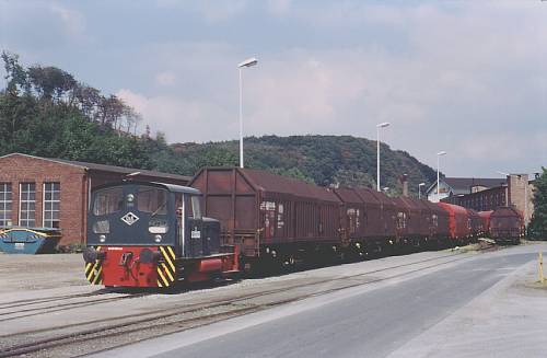 13.08.1999/ jm/ Das Werk wurde 1911 gegründet, seit 1923 besteht ein Bahnanschluß an die Bahnstrecke Hagen-Hohenlimburg. Der Anschluß wird von der DB bedient, für die werkinternen Rangieraufgaben stehen gleich zwei Lokomotiven zur Verfügung. Während die O&K bisher relativ bekannt war, ist die Gmeinder eher eine kleine Überraschung. Allerdings trifft man den O&K-Typ MV6b heute auch nicht mehr so oft im täglichen Einsatz. Früher gab es hier eine Deutz, davor war ein Akku-Schlepper im Einsatz, der 1964 verschrottet wurde.