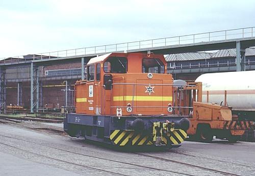 03.07.1998/ jm/ In diesem ehemaligen Stahlwerk werden seit den 1970er Jahren Waggons gebaut, vor allem Kesselwagen. So findet man auf dem Gelände auch Unmengen von Drehgestellen, Puffern und Tankböden. Die umfangreichen Gleisanlagen sind auch mit Schiebebühnen ausgestattet. Die Einsatzlok ist eine 1975 neu hierher gelieferte Henschel Typ DHG 300 B. Sie trägt die Nr. 1. Als Nr. 2 ist ein Zwei-Wege-Unimog, Baujahr 1982, im Einsatz. Die dritte Lok, eine Jung Typ RK 8 B, war heute nicht einsatzbereit. Diese Lok kam 1989 aus dem Krupp-Werk in Werdohl und hat eine interessante Ausführung der automatischen Kupplung.