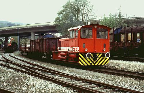 27.04.1998/ jm/ Wie immer war es kein Problem, bei dieser Bahn nach Fragen im Büro Fotos zu machen. Nach längerem Abladen eines Wagens begann die Esslinger der MEG mit Rangierarbeiten. Dabei ließen sich sehr gut Betriebsaufnahmen dieser nur etwa 500 m kurzen Privatbahn machen. Das Verkehrsaufkommen ist von etwa 90.000 t auf über 110.000 t gestiegen, da nach der Stillegung der DB-Strecke zum Bf Plettenberg-Oberstadt neue Kunden hinzu kamen, die jetzt ihre Wagen bei der MEG be- und entladen.