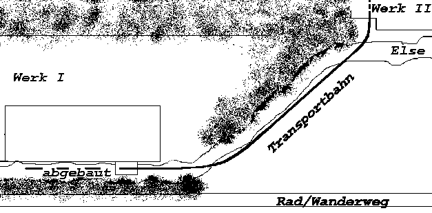 23.05.1998/ jm/ Dies ist vermutlich heute ein Unikum: Eine schmalspurige Bahn, die auf einem Gerüst über eine Wiese und über einen Bach führt, wird als Verbindung zwischen zwei Werksteilen genutzt. Der eingesetzte Elektro-Transportwagen bezieht den Strom über eine Schiene, die ähnlich wie bei U-Bahnen neben dem Gleis verläuft. Die Streckenlänge beträgt etwas mehr als 100 m. Früher dürfte die Strecke über dem Fluß Else an der Außenwand der Werkshalle weiter geführt haben. Davon zeugen heute noch Stützen, kurze Gleisreste und zugemauerte Türen. Die Spurweite dürfte 600mm betragen, konnte aber nicht nachgemessen werden, da man nicht an das etwa 2,5 m über dem Boden auf dem Gerüst liegende Gleis heran kommt!