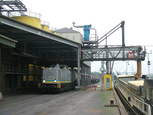 22.08.2005/ sk/ Im Hafen herrschte reger Betrieb: An der Ölmühle wurde gerade ein Zug beladen, den die 203 506 (LEW 14362/1962, Umbau Alstom Stendal 2004, Typ V100.4/203.5) der Fa. Stock am Abend nach Süddeutschland ziehen sollte, Lok 2 der Hafenbahn (O&K 26879/1976, MB300N) brachte einige Leerwagen zum Übergabebahnhof, wo die Loks V146 und V147 (LEW 12897/1972 und 12834/1971) der Regiobahn Bitterfeld (im Einsatz für die TWE) mit einem Stahlzug auf Ausfahrt gen Hbf warteten. Im Lokschuppen der Hafenbahn konnten auch die Loks 1 und 3 angetroffen werden.