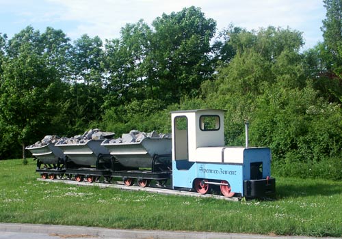 30.08.2005/ sk/ Die DEMAG-Feldbahnlok ist weiterhin vorhanden, sie steht als Denkmal mit drei Kipploren auf dem Lkw-Wendeplatz vor der eigentlichen Werkseinfahrt, gut von der Straße zu sehen. Die Identität der Lok ist mangels Schilder jedoch leider nicht festzustellen.