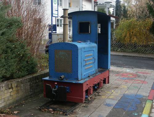 15.11.2003/ jm/ Die hier aufgestellte Feldbahn-Diesellok ist in bestem Zustand und steht auf dem Bürgersteig in der Straße "Am Kellerbusch" vor dem Kindergarten. Die Lok wird offensichtlich "bespielt", aber da sie nicht auf einem Spielplatz steht, wird sie hier als Denkmal aufgenommen. Wenn man zu der Lok fährt, muss ein bisschen durch das Wohngebiet kurven - ohne Straßenkarte von Dreieich eher nicht zu finden.