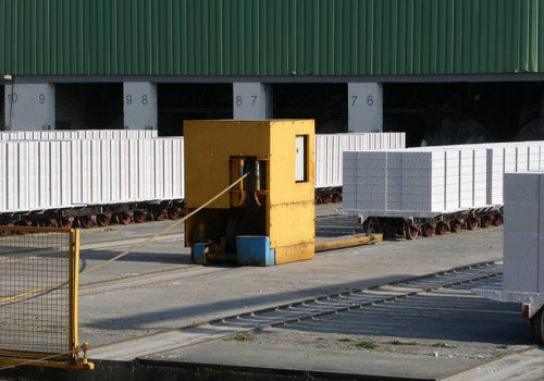 03.04.2007/ sm/ Es gibt hier eine eine (fast) vollautomatische elektrische Bahn in 600 mm Spurweite. Die Bahn belädt auf der vom Zaun nicht sichtbaren Seite des Werkes 12 röhrenförmige Brennöfen mit den Rohlingen, die auf der anderen Seite wieder heraus gezogen werden. Von Außen ist nur die Seite zu sehen, wo die fertigen Steine aus den Öfen herausgezogen werden. Die elektrische 'Lok' zieht zunächst an einem Drahtseil, welches von einem Arbeiter zwischen 'Lok' und Loren gekuppelt wird, die einzelnen zweiachsigen Loren aus den Öfen. Das Drahtseil vermutlich deswegen, weil die 'Lok' wohl nicht zu nah an die heißen Ofen heranfahren soll. Zur Zugkraftunterstützung kann hier ein zweites Drahtseil von einem Seilzug an der Rückseite der 'Lok' an der Schiebebühne befestigt werden. Sie werden dann ein paar Meter vor den Brennöfen zum Abkühlen abgestellt, und nach der Abkühlung von der 'Lok' im 3-er-Pak auf eine Schiebebühne gezogen. Dabei kommt dann kein Drahtseil mehr zum Einsatz, sondern die 'Lok' fährt mit einem langen Ausleger unter die Loren, klappt einen Haken hoch, und nimmt so drei Loren mit auf die Schiebebühne. Das Ziehen der abgekühlten drei Loren von den Gleisen auf die Schiebebühne allerdings erfolgt rein per Adhesion. Die Schiebebühne fährt dann vor Gleis 1 bzw. 2 (auf den Fotos ganz links), von der die Loren wieder in das Werk geschoben werden. Die Lok ist so kräftig, dass sie so viele Loren schieben kann, wie das Gleis lang ist. Allerdings hat sie dabei Reibungsunterstützung durch zwei Zahnstangen zwischen den Gleisen auf der Schiebebühne. Die Gleise 1 und 2, wo die Anlage die abgekühlten Loren hin bringt, sind zweispurig, das heist zwischen den 600 mm Gleisen befinden sich mittig nochmals Gleise mit einer geschätzten Spurweite von 400 mm. Auf diesen 400 mm Schienen fahren kleine per Seilzug gezogene Rollböcke unter den Loren hindurch, die sich an den Loren festhaken können, und sie so wieder in die Werkshalle ziehen, wo die Steine weiter verarbeitet werden. Ich vermute, dass sich eine ähnliche Anlage auch auf der anderen Seite der Brennöfen befindet.