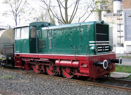 18.04.2004/ jm/ Als eigene Rangierlok wurde Nr. 2 gesichtet. Daneben steht derzeit ausgeachst die Lok Nr. 3 der Nassauischen Touristik-Bahn. Weiterhin ist auf dem Gelände ein rote Köf II vorhanden (322 607) - und eine sehr interessante dreiachsge Diesellok mit Stangen und Blindwelle. Bei dieser dürfte es sich um eine Lok vom Hersteller Krauss-Maffei Typ ML 440 C, ex. Hafenverwaltung Regensburg , handeln. Ein Fabrikschild war jedoch nicht zu sehen. Da mehrere Maschinen dieses Typs museal erhalten sind, ist keine sichere eindeutige Identifizierung möglich. Am wahrscheinlichsten ist die FNr. 17680/1951 der Firma Held, Baustoffhandel, Darmstadt-Ostbahnhof.