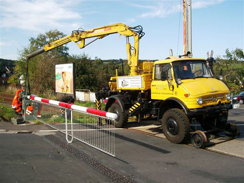 InfraServ: Am 10. Oktober 2004 kam der Zweiwege-Unimog der InfraServ Wiesbaden auf der Aartalbahn in Taunusstein