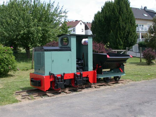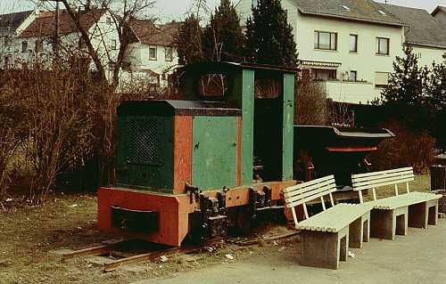 19.03.1996/ jm/ Hier steht zusammen mit einer Lore eine O&K-Feldbahnlok aus der Tongrube Maria, Waldbrunn-Hintermeilingen. Es soll sich lt. "Feldbahnen in Hessen" dabei um die FNr. 10948/1942 handeln, die bereits 1984 hier aufgestellt wurde. Auch an dieser Lok gibt es keine Fabrikschilder mehr.