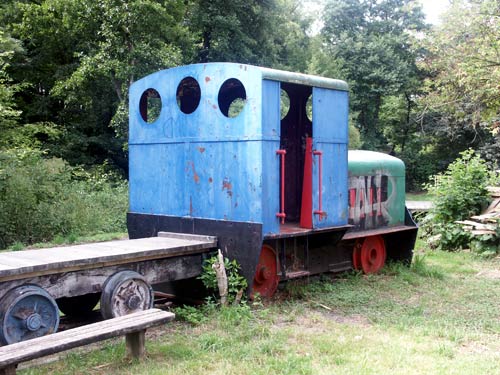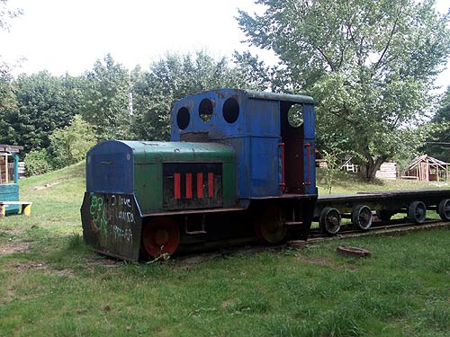 17.07.2004/ jm/ Auf dem Bauspielplatz steht eine normalspurige Deutz-Rangierlok mit Bullaugenfenster - genau genommen steht hier nur noch die Hülle einer Lok, denn so gut wie alle Teile auf dem Führerstand sind nicht mehr vorhanden und sebst die Räder sind irgendwie nicht mehr original. Hinter der Lok stehen zwei schmalspurige Flachwagen aus Holz - was aber erstaunlich ist: Die Wagen sehen genau so aus wie die Holzkipper, die z.B. beim Bau des Frankfurter Osthafens verwendet wurden!