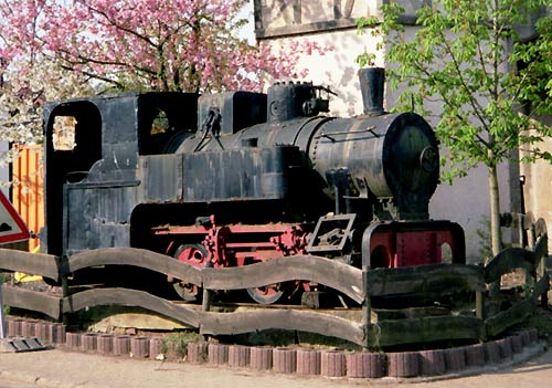 .04.2003/ mk/ Nicht weit vom Bahnhof ist beim Bahnübergang eine Dampflok als Denkmal aufgestellt. Eine telefonische Nachfrage beim Besitzer ergab, dass er weitere Dampfloks (früher Spielplatzloks) erworben hat, die aber alle zerlegt sind und zum Teil als Ersatzteilspender dienen. Dabei soll es sich um folgende Bn2t 660mm -Loks handeln: Krauss FNr. 6024/1908; Krauss FNr. 8449/1928; Hohenzollern FNr. 4612/1928.