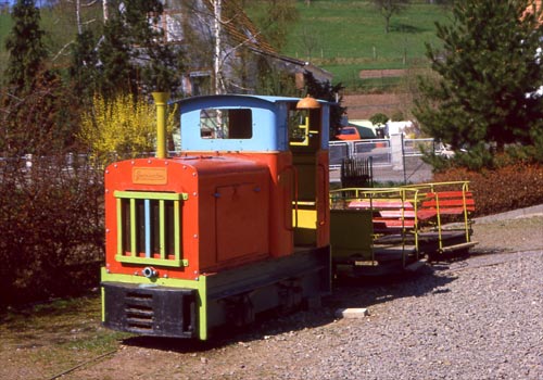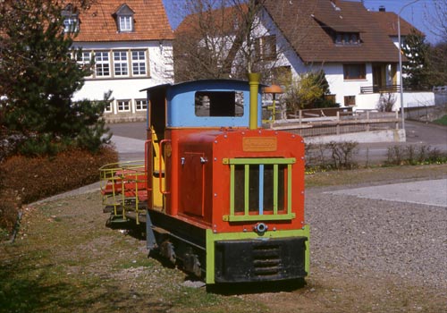 Spielplatz Haschbach: Am 14. April 1985 fotografierte Andreas Christopher die Gmeinder-Feldbahnlok in Haschbach.