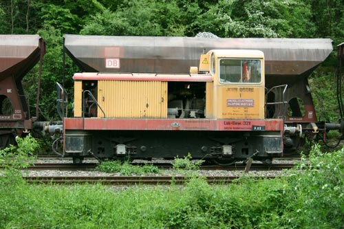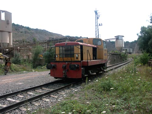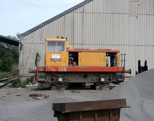 08.10.2006/ jr/ Der Steinbruch ist in seinen Dimensionen beeindruckend. An hohen Hängen wird das Material abgetragen und in dem Betrieb weiter verarbeitet. Bisher war hier eine der sehr wenigen in Deutschland eingesetzten dieselelektrischen Lokomotiven des französischen Herstellers Moyse im Einsatz (Bde 1132/67, BN32E180D). Da die Ersatzteilversorgung zunehmend schwieriger wurde, wurde diese Maschine abgestellt und diente anschließend für eine 2003 gekaufte baugleiche Maschine von John Deere, Werk Zweibrücken, Moyse 1079/65 als Ersatzteilspender. Nun scheint aber das Ende des Einsatzes dieser Maschinen gekommen zu sein. Beide Moyse Loks standen auf Holzbohlen neben den Gleisen. Die ursprüngliche Einsatzlok hatte sogar bereits ihren Dieselmotor eingebüßt. Stattdessen hat das Unternehmen über Railimpex, Mannheim, Cdh O&K 26779/73 MC500N erworben. Die Lokomotive war zuvor bei Opel in Rüsselsheim als Nr. 4 im Einsatz und trägt auch noch die für Opel typische gelb-weiße Lackierung. Zudem war Nr. 2 Bdh Essl 5304/63, Typ Bern, der Basalt AG, Theisbergstegen, vorhanden.