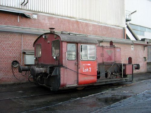 24.02.2003/ jm/ Hier soll es zwei Köf II geben, gesehen wurde nur eine Lok in roter Lackierung, die halb verdeckt hinter einer Verladeanlage stand. Eine zweite wurde nicht gesichtet, kann aber weiterhin vorhanden sein. Es wurde kein Versuch gestartet, eine Erlaubnis zum Fotografieren der Maschinen auf dem Gelände zu erhalten.