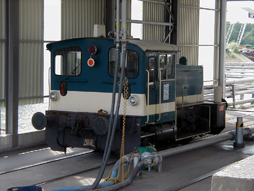 So stehen also eine rote Gmeinder (Köf III) an der Essener Str. und eine blau-beige Jung (Köf III) am Becken 24 in ihren arbeitsfreien Zeiten meist unter den überdachten Abfüllstationen, um ihre original DB-Farbanstriche zu schonen.