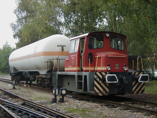 10.10.2003/ pw/ Die O&K 26674 mit der Betr.-Nr. 378 (bzw. "Lok II") konnte hier bei ihrer Arbeit mit Gaskesselwaggon beobachten werden. Diese Firma hat Anschluss an die Hafenbahn.