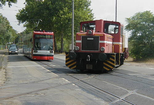 SCA Hygiene Products: Die derzeit eingesetzte Lok kreuzt auf dem Weg ins Werk die Straßenbahn nach Sandhofen. (Fotos: 19.08.2003, Peter Weinsheimer)