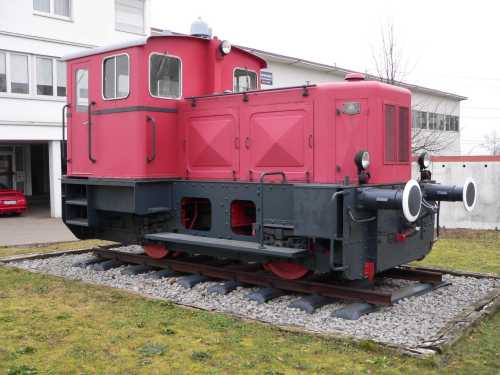 26.09.2001/ jm/ .01.2006/ wb/ Als Denkmal steht im Vorgarten eine BMAG-Diesellok - gut von der Straße aus fotografierbar. Die Lok war hier nie im Einsatz, es gibt ja auch keinen Bahnanschluss.