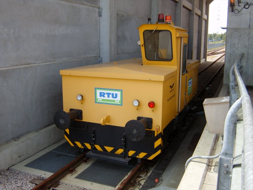 02.06.2003/ jm/ tss/ Im Rheinhafengebiet der Stadt Karlsruhe war Anfang der 1990er Jahre mit den Planungen eines konventionellen Müllheizkraftwerk begonnen worden. Aus ökologischen und wirtschaftlichen Gründen entschied man sich letztendlich jedoch für eine Thermoselect-Anlage, bei der der Müll im Hochtemperaturreaktor mit Temperaturen bis zu 2000 Grad C verbrannt bzw. vergast wird. Die Anlage ging im Januar 1999 nach insgesamt zwanzig-monatiger Bauzeit in Betrieb und wird von der Thermoselect Südwest GmbH betrieben, welche eine hundertprozentigen Tochtergesellschaft der Energie Baden-Württemberg AG EnBW ist (selbige setzt im nahe gelegenen Rheinhafen-Dampfkraftwerk die bekannte DH 440 von allrad Rangiertechnik ein). Die Thermoselect-Anlage Karlsruhe verfügt über drei thermische Linien zur Abfallbehandlung und hat eine Jahresdurchsatzleistung von 225.000 Tonnen. Die Anlieferung des Restmüll aus der Stadt Karlsruhe, dem Landkreis Karlsruhe, der Stadt Baden-Baden und dem Landkreis Rastatt erfolgt per LKW und Bahn. Die Bahnanlieferung ist dabei auf eine Jahreskapazität von 60.000 Tonnen ausgelegt. Da die Anlieferung an 6 Tagen in der Woche erfolgt, ergibt sich eine durchschnittliche Anlieferung von 200 Tonnen am Tag, so dass rund 27 % des Mülls mit der Bahn angeliefert werden. Die Waggons werden auf dem werkeigenen Anschlussgleis bei der Anlieferung gewogen. Hier kommt ein gelbes Rangiergerät von Windhoff Typ Tele-Trac RW 50 DH zum Einsatz- Die technischen Daten dieses Fahrzeugs: