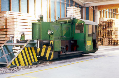 02.06.2003/ ak/ Diese Firma liegt ebenfalls im Karlsruher Rheinhafen und beschäftigt sich mit dem Im- und Export von Holz. Zum Verschub ist eine grün lackierte Köf II vorhanden, die am Besuchstag betätigungslos in einer großen Lagerhalle stand. Die Lok, übrigens Vorbild für ein N-Modell der Firma Arnold, macht einen gepflegten Eindruck.