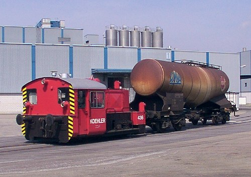 31.05.2003/ jm/ Die Köf II mit der Registrierungs-Nummer 436 ist hier im Einsatz. Einen sehr guten Blick auf die Bahn hat man von der Wiese vor dem Werk aus.