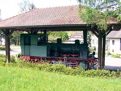 01.05.2003/ jm/ Unter einem Dach, so zumindest etwas gegen Regen geschützt, steht ein Hanomag-C-Kuppler. Laut den Hinweistafeln handelt es sich um "Die letzte Dampflok des Tales, gestiftet der Gemeinde Unterharmersbach". Die letzte Fahr war demnach 1964. Die Lok wurde von der Holzer GmbH & Co. (Masco Corp.) gestiftet, dieses Firma liegt in unmittelbarer Nähe beim Denkmal.
