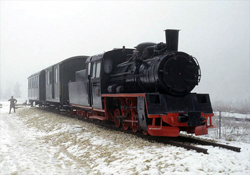 02.02.1992/ mu/ Der ehamlige Haltepunkt Durlesbach, an der Strecke Ulm - Friedrichshafen südlich von Aulendorf gelegen, wurde durch ein schwäbisches Volkslied bekannt. An die "Schwäbische Eisenbahn" erinnert hier jetzt eine polnische Px zusammen mit drei Bonze-Figuren (Bauer, Gaisbock und Schaffner).