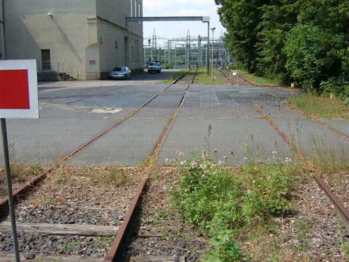 13.07.2005/ muy/ Eine Werkbahn ohne Lok, aber mit einer Drehscheibe mit drei (!) Gleisen. Das Anschlußgleis geht ab Bhf. Nürnberg-Stein über zwei Straßen zu E.ON, seit etwa 5 Jahren finden allerdings keine Bedienung mehr statt. Zuvor gab es Trafoanlieferung durch die DB. Die Drehscheibe soll noch dieses Jahr verfüllt werden.