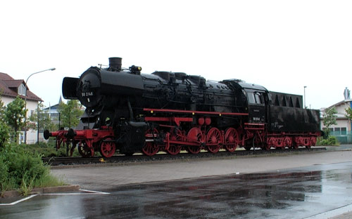 11.11.2003/ pz/ 21.05.2004/ mki/ Die PFA Weiden befindet sich nördlich des Bahnhofs im Industriegebiet West. Die auf dem Parkplatz als Denkmal aufgestellte 50 2146 (Franco-Belge 1943) konnte ich nur bei regnerischem Wetter ablichten (dafür ohne davor parkenden Autos). Die Lok hat, obwohl erst 1943 gebaut, nicht den vereinfachten ÜK-Kessel wie z.B. die 1942 gebaute 50-2988, sondern den üblichen dreidomigen 50er-Kessel. Fraglich ist, was mit der Lok passiert, wenn die PFA endgültig geschlossen wird.