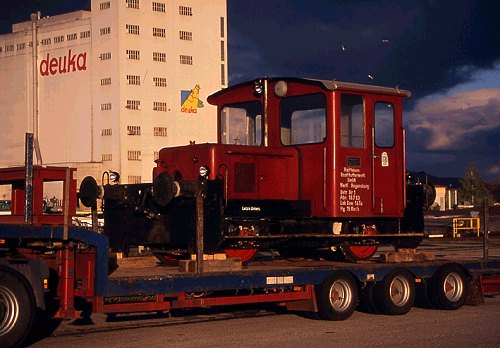 Doch im September 2002 hat sie per Tieflader eine größere Reise ins Herstellerwerk zur Firma Gmeinder nach Mosbach unternommen um dort eine erforderliche Untersuchung zu erhalten. Von dieser Reise, die sie am 24.09.2002 angetreten hat, ist die Lok am 18.10.2002 zurückgekehrt und konnte am Samstag, dem 19.10.2002, - noch auf dem Tieflader der Firma Mottinger verladen - im Hafen Regensburg abgelichtet werden. Die Lokomotive ist also wieder für einige Jahre für neue Taten gerüstet.