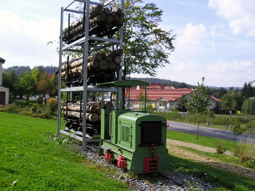 19.09.2004/ mw/ In Spiegelau befindet sich ein Feldbahndenkmal, welches an die ehemalige Spiegelauer Waldbahn erinnert Es besteht aus einer Gmeinder-Dieselfeldbahnlok mit 600 mm Spurweite und drei Holztransportwagen, die allerdings übereinander gestapelt wurden.