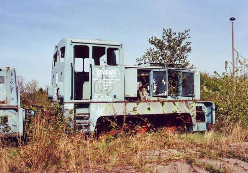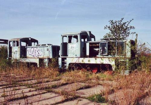 .04.2006/ rb/ Im Westen von Erfurt gibt es eine Strecke von Erfurt Nord nach Erfurt-Bindesleben Flughafen. Diese Strecke ist jetzt hinter der Kyffhauserstrasse abgebaut, hier zweigt allerdingsein Gleis nach Osten zum Gbf Erfurt-Marbach ab. Dieser ist ebenfalls stillgelegt, aber die Gleise sind noch vorhanden. Es gab offensichtlich einen Anschluss an die Silos der Ergewa (heute Deuka) und an ein Heizkraftwerk. Zwei ehemalige Lokomotiven stehen auf einem Abstellgleis bei einem Schrotthandel.