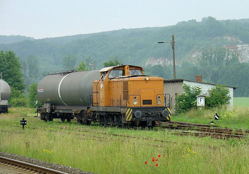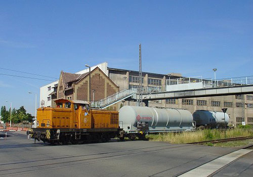 04.09.2007/ jm/ Im Bahnhof stehen sehr viele Kesselwagen, auf dem Werksgelände sind weitere zu finden. Eine LKM V23B als eigene Werklok wurde nicht gesichtet, dafür steht auf dem Gelände eine Köf II als Ersatzteilspender, deren Identität aber nicht festgestellt werden konnte (Betriebsnummer am Führerhaus und auf dem Batteriekasten ist nicht mehr lesbar).