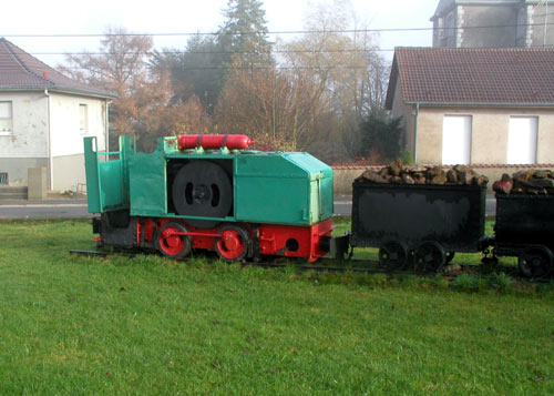 24.11.2004/ jl/ Das Denkmal Deutz FNr. 9583, Typ MLH232F, in der Rue de l'Hopital bei der Kirchein Hussigny-Godbrange (Frankreich, in der Nähe von Longwy) existiert noch. Die Lokomotive soll von der örtlichen l'Exploitation Commun des Mines a Hussigny-Godbrange stammen.