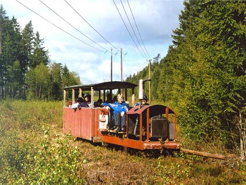 13.05.2004/ uv/ Die alte Torffabrik wird immer noch in bescheidenem Rahmen betrieben. Nach wie vor existiert eine ca. 3 km lange Feldbahn ins Moor, dort steht eine rollende Aufenthaltsbude. Es gibt keine Abzweiggleise, es erfolgt nur Handstich entlang des Stammgleises. Am Stichtag fuhr der Torfwerksbesitzer eine Horde Kindergartenkinder auf der Feldbahn spazieren. Für diese Zwecke gibt es extra einen Personenwagen. Die einzige vorhandene Lok steht sonst bei Betriebsruhe unter einer beiderseits zugänglichen Überdachung. Darüber hinaus steht im Torfwerksgebäude noch eine blaue Lok, die dem Eisenbahnfreund Gustav Svensson gehört. Diese ist z.Zt. nicht fahrbereit (ausgebaute Achse).