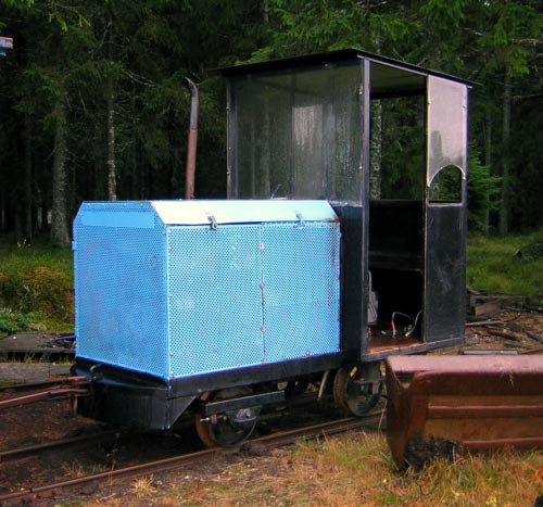 BMR Produkter AB: An der separaten Abbaustelle stand die rote Eigenbaulok mit einigen Loren abgestellt. (Foto: 04.08.2003, Lars Höpel)