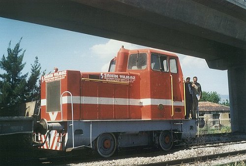 29.04.2002/ Eine interessante und seltene Lokomotive aus dem Hause Linke-Hofmann-Busch LHB ist in der Türkei wieder aufgetaucht. In Izmir-Hilal unterhalb der Metro-Strecke konnte die Lok im Bauzugdienst fotografiert werden. Die Lok fährt für die Firma "Sahin Yilmaz, Enerji Insaat Taahüt Sanayi ve Tic. LTD. S." Bauzüge im Raum Izmir, Türkei. Dort werden die Vorortstrecken zweigleisig ausgebaut (sofern nicht vorhanden) und elektrifiziert. Anfang Mai 2002 wurde die Lok dabei von einer neu gebauten Laderampe in Izmir-Halkapinar aus eingesetzt, um (jeweils einen) Betonmisch-Lkw auf einem Flachwagen zu den jeweiligen Baustellen zu bringen. Anfang Mai war der Bereich um den berühmten Block B in Izmir-Hilal das Ziel, also der Bereich der nahezu rechtwinkligen Kreuzung der beiden zwei bzw. dreigleisigen Strecken in Izmir.