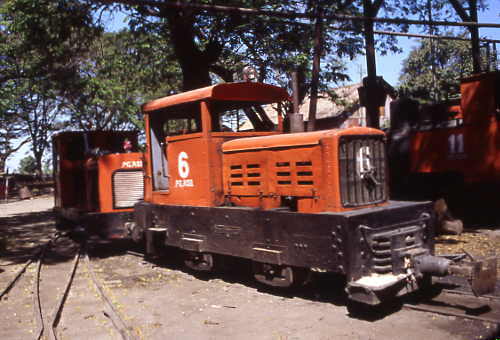 10.08.2003/ pk/ Es gibt nur noch eine Ringstrecke zwischen LKW-Verladung und Brecher. Die Wagen werden dabei von fünf verschiedenen Loks bewegt. Zuerst ziehen die LKWs, nachdem ihr Zuckerrohr auf einen Wagen verladen wurde, aus der Verladung. Von dort aus ziehen die Mallets den Zug zum Brecher. Dort werden sie von den zwei japanischen Dieselloks Nr. 13 und 14 durchgeschoben und wieder entladen. Nach dem entladen rollen sie an die Schöma Nr. 10. Die zieht sie dann zum Sammelbahnhof vor der LKW-Verladung. Dort werden sie dann wieder nach und nach von Ochsen-Doppelgespannen in die Verladung gezogen. Zum Besuchszeitpunkt waren die Mallets Nr. 212 und 228 an der LKW-Verladung im Einsatz. Nr. 214 stand frisch angeheizt zur nachmitttäglichen Ablösung vor dem Lokschuppen. Im Lokschuppen befanden sich weitere, teils zerlegte, abgestellte Mallets. Im Werksgelände ist Nr. 1 als Denkmal aufgestellt.