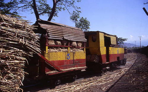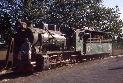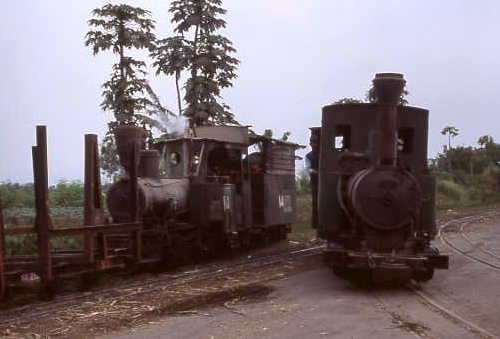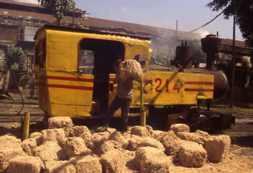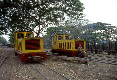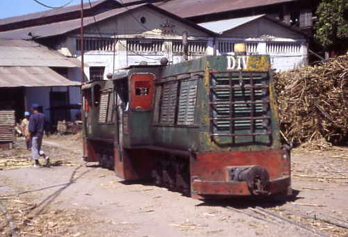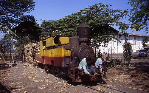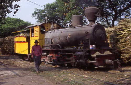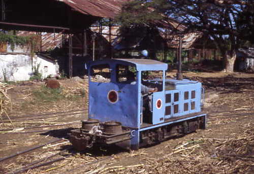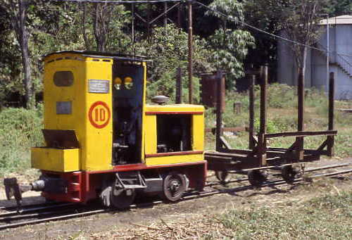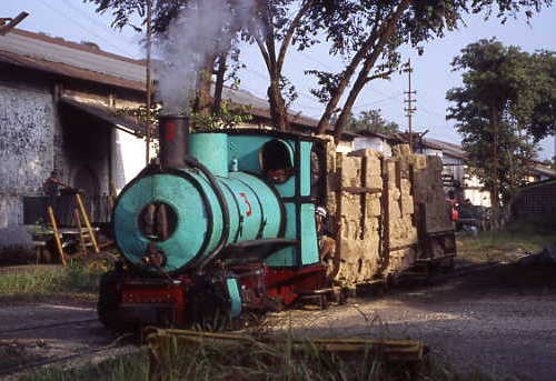 07.08.2003/ pk/ Die Strecke führt vom Werk aus in zwei verschiedene Richtungen in die Felder sowie zum Hafen. Es herrschte reger Verkehr mit Dieselloks. Nach einer ausführlichen Werksführung wurden wir mit der einzigen unter Dampf stehenden Dampflok Nr. 10 zum Hafen und wieder zurück gefahren. Dampflok Nr. 11 stand kalt vorm Lokschuppen. 3 weitere Dampflokwracks standen auf dem Werksgelände verteilt rum. Bei den Dieselloks waren Nr.1, 3, 4, 6, 7 und 9 in Betrieb. Die Loks Nr. 5 und 8 standen aufgebockt im Lokschuppen. Nr. 2 stand schrottreif (ohne Motor und Getriebe) im Lokschuppen. Es könnten sich weitere Dieselloks in den Feldern befunden haben.