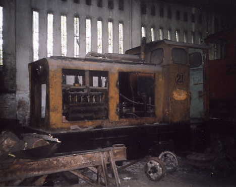 10.08.2003/ pk/ Auch hier gibt es nur noch den Verkehr zwischen LKW Verladung und Brecher. Am Brecher rangierte Dampflok Nr. 2. Zwischen LKW Verladung und Brecher fuhren die Loks Nr. 5, 6 sowie mehrere Traktoren. Im Lokschuppen standen zwei nicht mehr betriebsfähige Dieselloks. Vor dem Lokschuppen standen Die Dampfloks Nr. 4 und 8 kalt aber betriebsfähig abgestellt. Hinter dem Lokschuppen entdeckte ich den Überrest einer Diema Draisine. Eine Identifizierung war wegen fehlenden Schilder nicht mehr möglich. Es könnte sich aber um die Reste von Diema FNr. 3222 handeln. Hier gibt es keine weiteren Dampfloks.