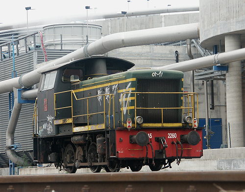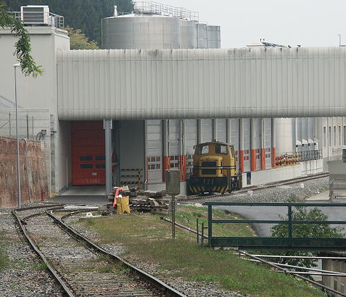 18.10.2003/ jm/ Cinzano kennt eigentlich jeder, der sich öfter in der Getränkeabteilung auf der Suche nach Spirituosen rumtreibt. Mitten im gleichnamigen Ort liegt das Werk, welches mittlerweile nicht mehr den Namen Cinzano, sondern Diago trägt. Das hier weiterhin Alkohol verarbeitet wird, kann man riechen. Zwar führt die Bahnstrecke (Bra-Asti) weit oberhalb hinter den Werksanlagen vorbei, dennoch gibt es einen Gleisanschluss zum Bahnhof Cinzano, der bis in das Werk hinein eine ordentliche Steigung aufweist. Eingesetzt wird eine werkeigene Rangierdiesellok, die gelb lackiert ist und zur Wochenendruhe auf dem Gelände stand. Offensichtlich handelt es sich um eine Deutz Typ KG230B, jedoch bleibt die Suche in der Deutz-Liste erfolglos. Ggf. handelt es sich um einen Greco-Lizenzbau? Die Anordnung der Lampen weicht von der Deutz-Type ab. Früher wurde hier eine Henschel-Dampflok eingesetzt, die bis heute als Denkmal auf dem Werksgelände überlebt hat. Sie ist allerdings leider von aussen nicht zu sehen. Das die Lok noch vorhanden ist, hat der Pförtner bestätigt. Das Photografieren konnte er nicht erlauben, in der Woche dürfte es möglich sein.