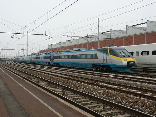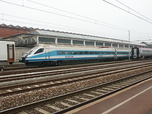 18.10.2003/ jm/ Wie immer stehen im Bahnhof Triebwagen aus dem Hause Alstom. Darunter ein zweiteiliger Diesel-Pendolino Typ ATR 410 (95839 410992-2 und 95839 410991-1), der FS-Triebzug 92839 470...-. (restliche Stellen fehlen am Fahrzeug) mit Alstom-Beschriftung und ein weiterer elektrischer Triebzug ohne Beschriftung und Blau-Grau-Gelber Lackierung. Von der Triebkopfform sind alle diese Fahrzeuge gleich. Die hier vermutlich immer noch eingesetzte werkeigene Rangierlok wurde leider wieder nicht angetroffen.