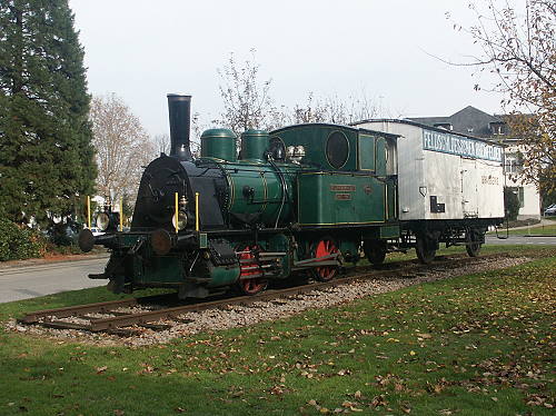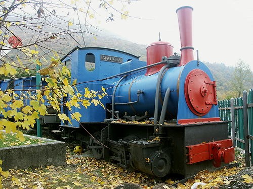 14.11.2003/ jm/ Zusammen mit drei Wagen (zwei Personenwagen, ein kurzer Flachwagen) steht hier die älteste bis heute erhaltene Lokomotive von Jung-Jungenthal. Die Lok trägt das Schild "F. Marti, Winterthur" und den Namen "MAGGIA" - so heißt auch der Fluß, der nur wenige Meter entfernt von dem Denkmal ist und in den Lago Maggiore fließt. Die Lok ist von der Straße aus gut zu sehen, jedoch steht sie dicht am Zaun und an den Bäumen, so das sie von vorne nur schwer aufs Bild zu bekommen ist (sofern 28 mm Weitwinkel vorhanden). Jetzt im Herbst ist es noch halbwegs machbar, im Sommer verschwindet die Lok hinter dichtem Grün.