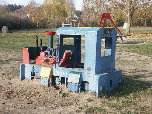 15.11.2003/ jm/ Auf dem Spielplatz steht eine kleine Feldbahnlok, die "kindgerecht" umgebaut wurde. So wird der Motorvorbau jetzt als Führerhaus genutzt, das Getriebe ist praktisch der Motor mit - klar - "Dampflokschornstein". So fährt die Jugend mit dieser Lok eigentlich in die verkehrte Richtung. Dieses so etwas komisch anmutende Fahrzeug wurde 1979 im Austausch gegen eine Dampflok, die vorher hier stand, auf dem Spielplatz aufgestellt. Dabei handelt es sich eigentlich um eine relativ seltene Maschine, denn die Lok wurde 1949 von Schöma für O&K gebaut. Die Lok ist "den Umständen entsprechend in gutem Zustand", der Spielplatz selbst hingegen wird leider wohl auch als Altglascontainer und Hundeklo mißbraucht (mal wieder ein Fall für´s Ordnungsamt...).