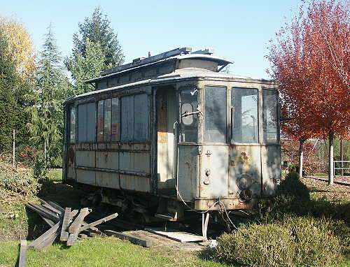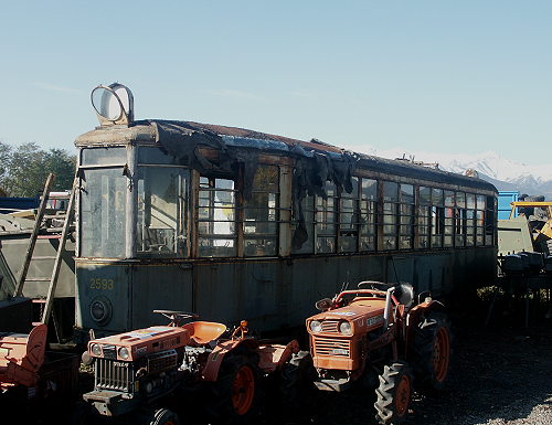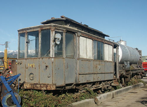 02.11.2003/ jm/ An der Kreuzung der SS589 von Turin mit der SS23 von Pinerolo nach Buriasco (die ist wie eine Autobahnkreuz ausgebaut) liegt, wenn man Richtung Buriasco fährt, direkt hinter der Kreuzung auf der rechten Seite ein Gelände, welches ein Schrottplatz oder Fahrzeughandel mit angeschlossenem Museum (?) zu sein scheint. Jedenfalls stehen neben allem möglichen neuen und älteren Straßenfahrzeugen hier im Garten ein Düsenflugzeug und eine kleine Tram. Eine zweite kleine Tram steht unweit davon auf dem Platz zusammen mit einem Kesselwagen. Eigentlich war das Gelände geschlossen (Sonntags morgens ja nicht anders zu erwarten), jedoch wurde das Fotografieren der Trams erlaubt (wobei offenbar sonst "die Leute" sich eher für den Düsenflieger interessieren) und auf Nachfrage wurde dann auch noch der dritter Straßenbahnwagen etwas modernerer Bauart auf dem Platz gezeigt. Die Fahrzeuge stammen alle aus Turin, wobei die zweiachsigen schon etliche Jahre auf dem Buckel haben. Natürlich habe ich auch gleich mal nach Lokomotiven gefragt, aber die hat man hier leider nicht.