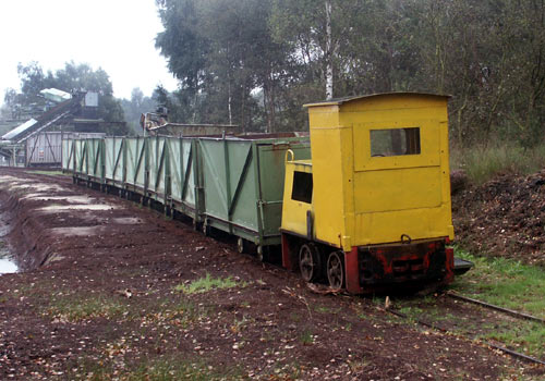 12.09.2005/ jm/ Das alte Torfwerk hat ein normalspuriges Anschlussgleis, welches allerdings nicht mehr in Benutzung ist, die einstige Normalspurlok (Krupp-Motorlok-Nr. 524) ist nicht mehr vorhanden. Die Feldbahnstrecke führt aus dem Werk in Richtung Osten an der alten Ziegelei vorbei, welche heute als Torfwerk bzw. als Torflagerstätte genutzt wird. Torfbahn und Ziegeleibahn führten früher parallel Richtung Osten, später wurden die beiden Bahnen zu einer Strecke zusammengefasst. Die Ziegeleibahn bog nach ca. 1 km nach Norden zum Bruch ab. Dieser Abzweig ist heute noch zu sehen.