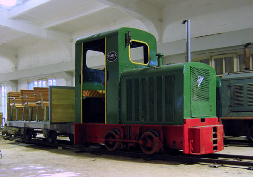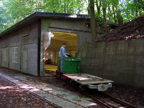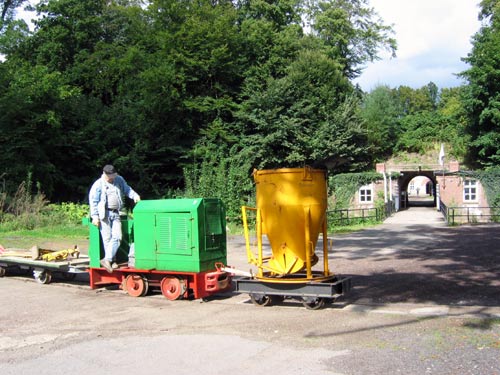 16.09.2005/ jm/ Um die Festung herum verläuft die Feldbahn des Feldbahnvereins, der nicht identisch ist mit dem Förderverein der Festung Grauerort (jedoch sind wohl etliche Mitglieder in beiden Vereinen tätig). Die Lokhalle befindet sich etwas abseits der Festung im Wald und bietet noch reichlich Platz für weitere Exponate. Angetroffen wurden drei Lokomotiven (eine davon von Privat leihweise hier) und diverse Wagen, darunter dieses Jahr entstandene Besucherwagen, die auf den vorrausichtlich ab nächsten Jahr stattfindenden öffentlichen Fahrten eingesetzt werden. Die Feldbahn wurde beim heutigen Besuch als Transportbahn für Baumaterial genutzt, zum Einsatz kam dabei die Nr. 7 (Diema FNr. 1420). Dies Lok und die Deutz FNr. 22792 sind aufgearbeitet.